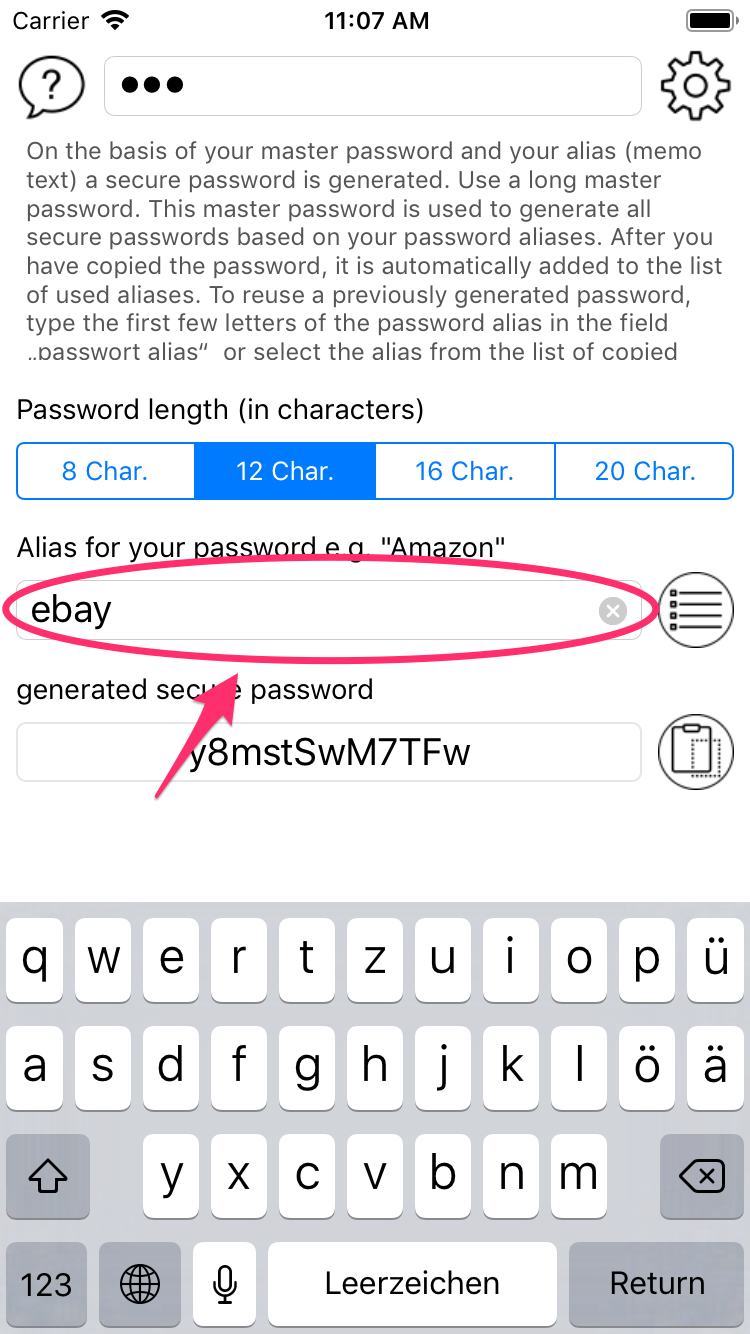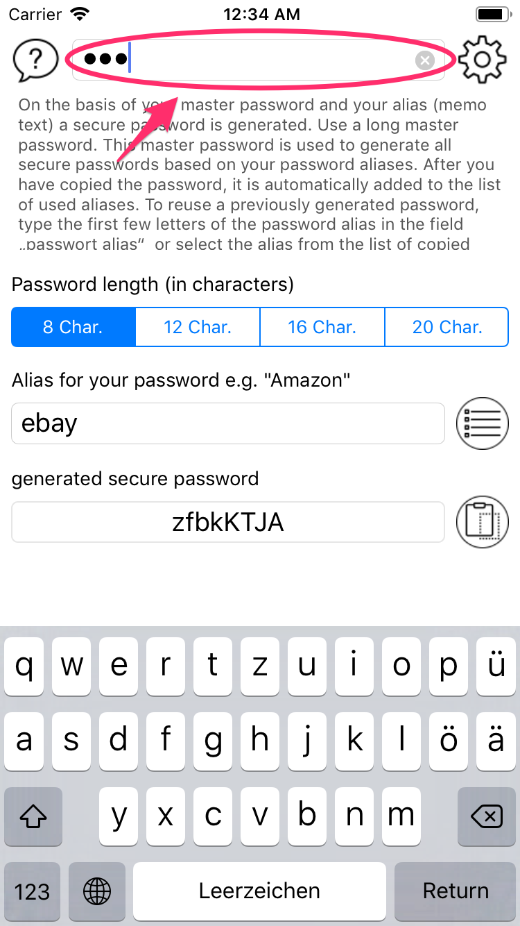 | 1. | The first time you use the app you have to assign the strongest possible password as the master password. This master password is used to encrypt your passwords. Only with the correct master password the correct passwords will be generated for your aliases. |